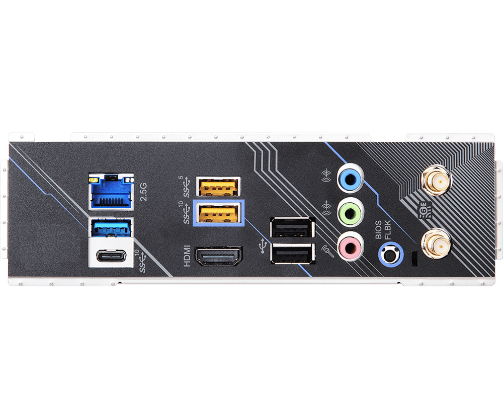 • 2 x Antenna Ports • 1 x HDMI Port • 2 x USB 3.2 Gen2 Type-A Ports (10 Gb/s)* • 1 x USB 3.2 Gen1 Type-A Port* • 1 x USB 3.2 Gen2 Type-C Port (10 Gb/s) • 2 x USB 2.0 Ports • 1 x RJ-45 LAN Port • 1 x BIOS Flashback Button • HD Audio Jacks: Line in / Front Speaker / Microphone