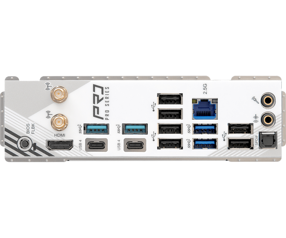 • 2 x Antenna Ports • 1 x HDMI Port • 1 x Optical SPDIF Out Port • 2 x USB4 Type-C Ports (40 Gb/s)* • 4 x USB 3.2 Gen1 Type-A Ports • 6 x USB 2.0 Ports • 1 x RJ-45 LAN Port • 1 x BIOS Flashback Button • 1 x Line Out Jack (Gold Audio Jack) • 1 x Microphone Input Jack (Gold Audio Jack)