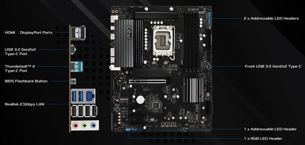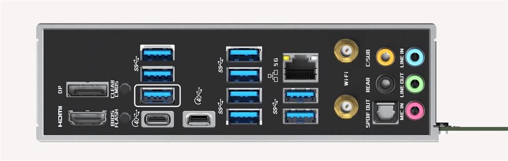 • 1 x HDMI Port • 1 x DisplayPort 1.4 • 2 x Thunderbolt™ 4 Type-C Port (40 Gb/s for USB4 protocol; 40Gb/s for Thunderbolt™ protocol) • 9 x USB 10G Type-A ports • 1 x RJ-45 LAN Port • 1 x BIOS Flashback Button • HD Audio Jacks: Line in / Front Speaker / Microphone